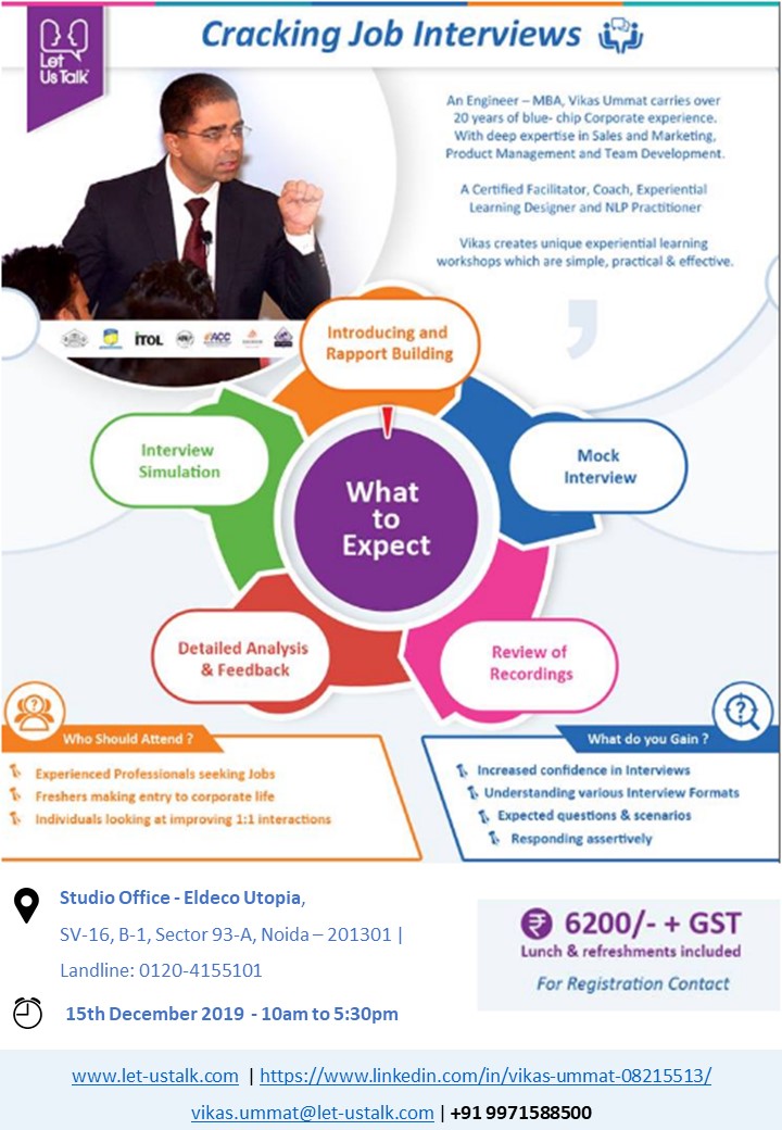 Cracking Job Interviews | Studio Office - Eldeco Utopia, SV-16, B-1, Sector 93-A, Noida – 201301 | Landline: 0120-4155101 | 2019-12-12 | 2019-12-14 | View Details |